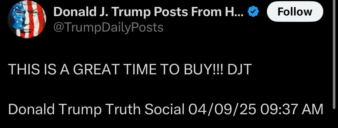 Four hours before he announced the 90-day pause, he wrote on Truth Social, “THIS IS A GREAT TIME TO BUY!!! DJT,” just after U.S. markets opened on Wednesday morning.
